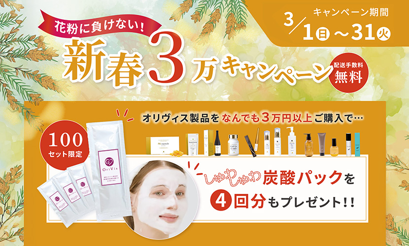 今月はオリヴィス製品を合計3万円以上ご購入いただいた方に、エステサロンでも大好評の「しゅわしゅわ炭酸パック」4回分をプレゼントいたします!
